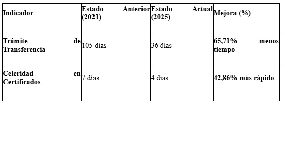 A fines de 2024, el RGI alcanzó el 100% de la digitalización de sus libros. Bajo un enfoque de periodismo enfocado en soluciones, la gestión se valida con datos, por lo que es imperativo destacar que esta modernización no es solo técnica, sino que presenta resultados sociales medibles, impactando directamente en la eficiencia del servicio de justicia. Según el Informe de Seguimiento del RGI —documento de control interno del Poder Judicial que audita 13 tipos de trámites—, la mejora es contundente: